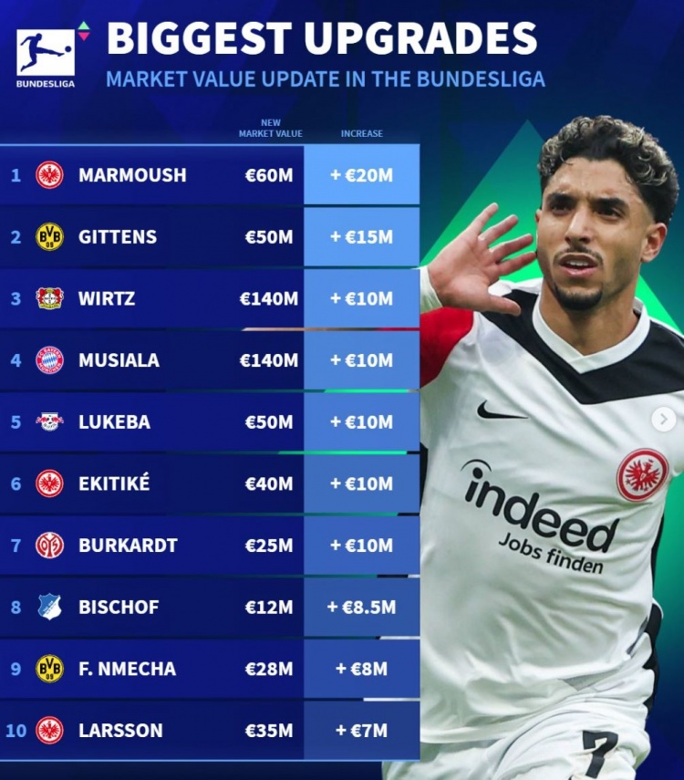 德轉(zhuǎn)德甲身價(jià)漲幅榜:馬爾穆什暴漲2000萬歐,德國雙星各漲1000萬