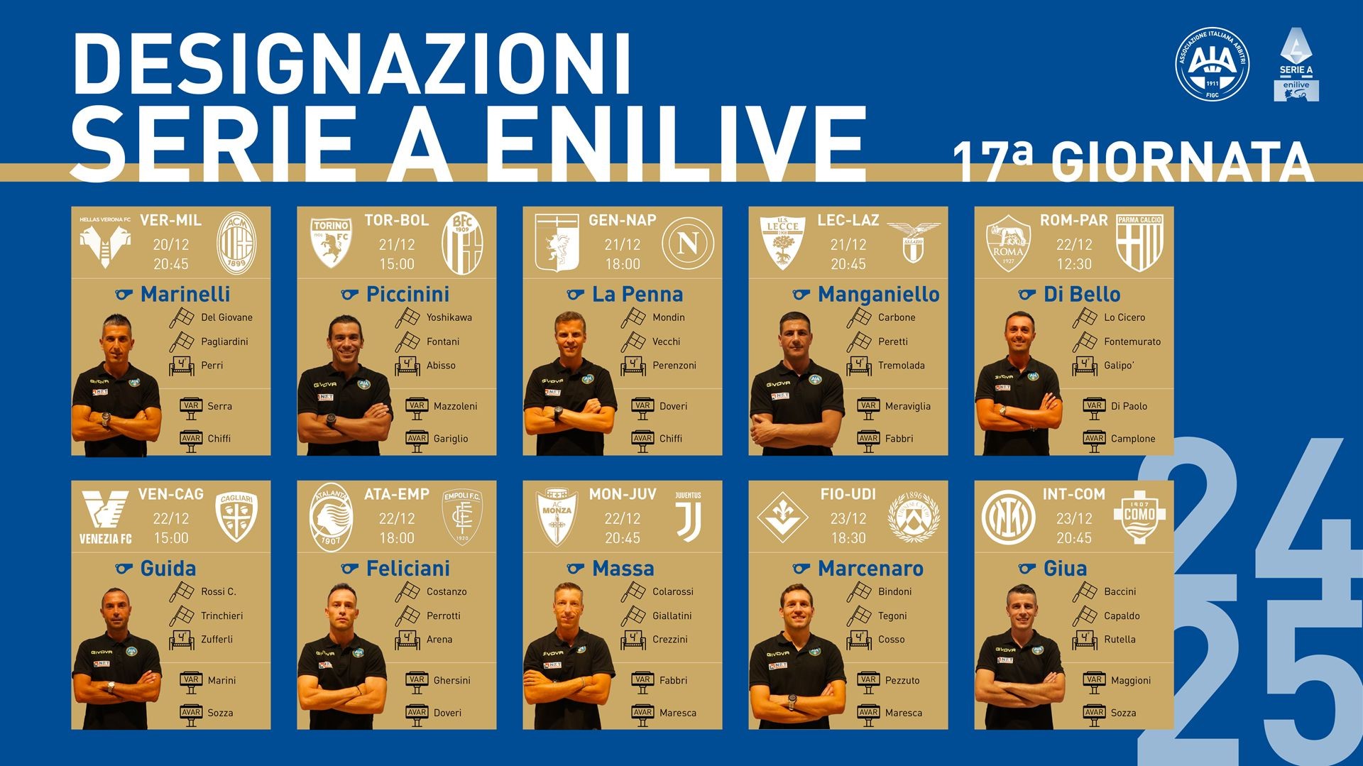 12月20日訊 意甲第17輪各場(chǎng)執(zhí)法裁判公布,馬薩執(zhí)法蒙扎尤文,迪貝洛執(zhí)法羅馬帕爾馬。