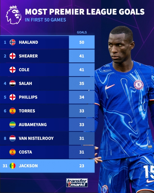 把范圍放大到整個(gè)英超歷史,杰克遜的前50場(chǎng)英超進(jìn)球數(shù)也高于蘇亞雷斯、盧卡庫和魯尼,他的數(shù)據(jù)排名第31位,排名榜首的是哈蘭德的50球。