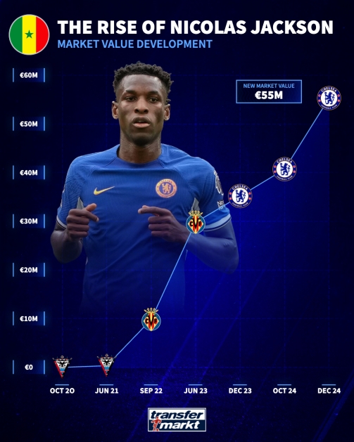 在以3700萬歐元轉(zhuǎn)會(huì)費(fèi)加盟切爾西后,杰克遜的身價(jià)已經(jīng)連續(xù)3次上漲,總共上漲2500萬歐元,目前位5500萬歐元。