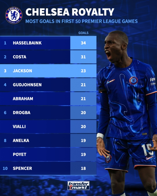 切爾西前鋒前50場(chǎng)英超進(jìn)球數(shù)
