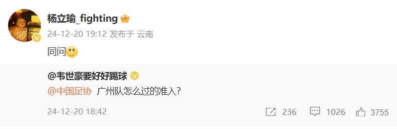12月20日訊 韋世豪發(fā)聲質(zhì)疑后,楊立瑜轉(zhuǎn)發(fā)韋世豪微博質(zhì)疑足協(xié)準(zhǔn)入。