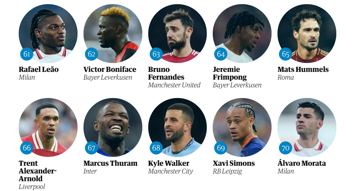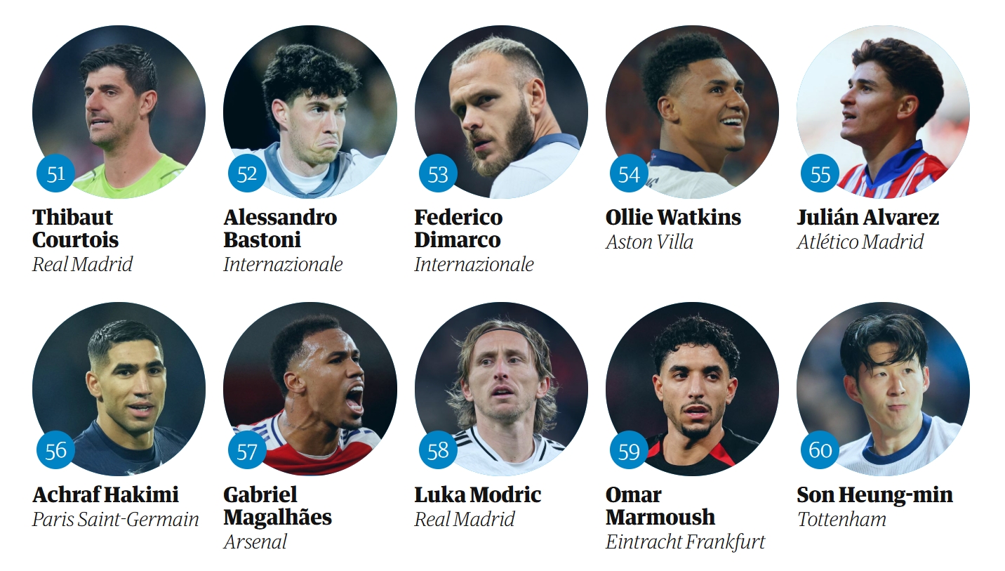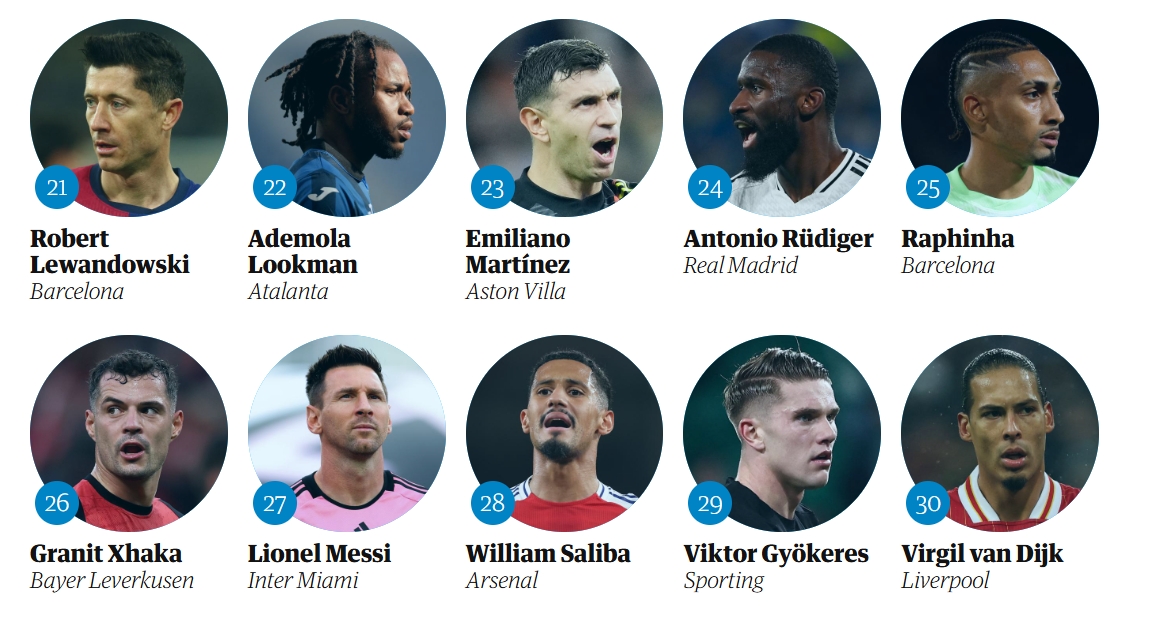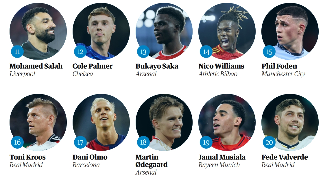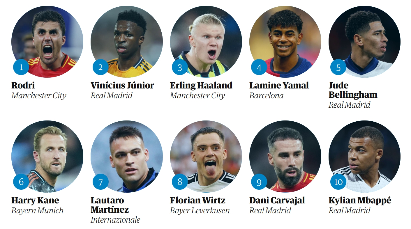 1-羅德里、2-維尼修斯、3-哈蘭德、4-亞馬爾、5-貝林厄姆、6-凱恩、7-勞塔羅、8-維爾茨、9-卡瓦哈爾、10-姆巴佩