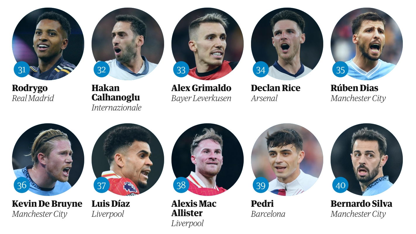 31-羅德里戈、32-恰爾汗奧盧、33-格里馬爾多、34-賴斯、35-魯本-迪亞斯、36-德布勞內(nèi)、37-路易斯-迪亞斯、38-麥卡利斯特、39-佩德里、40-B席