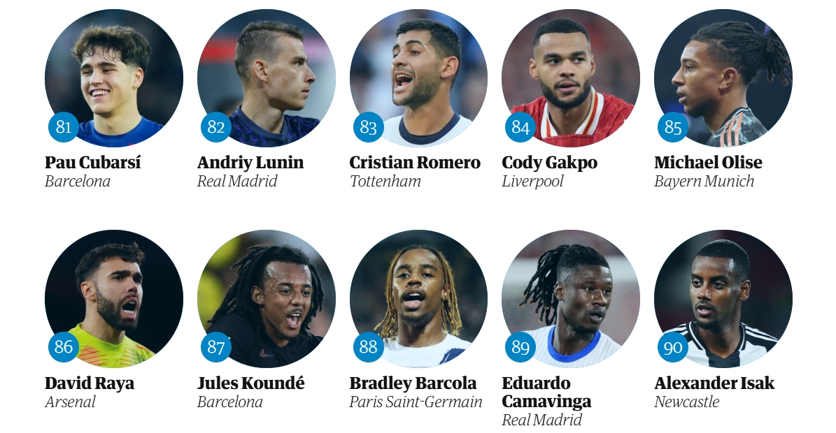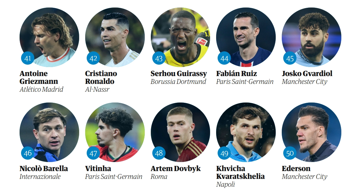 41-格列茲曼、42-C羅、43-吉拉西、44-法比安-魯伊斯、45-格瓦迪奧爾、46-巴雷拉、47-維蒂尼亞、48-多夫比克、49-克瓦拉茨赫利亞、50-埃德森