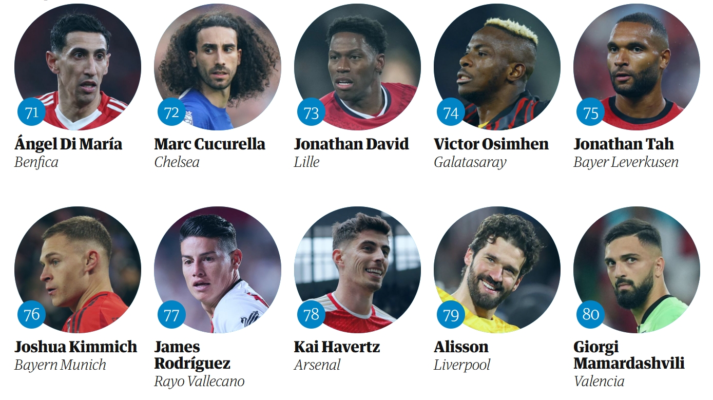 71-迪馬利亞、72-庫(kù)庫(kù)雷利亞、73-喬納森-戴維、74-奧斯梅恩、75-喬納森-塔、76-基米希、77-J羅、78-哈弗茨、79-阿利森、80-瑪瑪達(dá)什維利