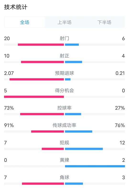 切爾西5-1沙姆洛克流浪數(shù)據(jù):射門20-6,射正10-4,進(jìn)球機(jī)會(huì)5-0
