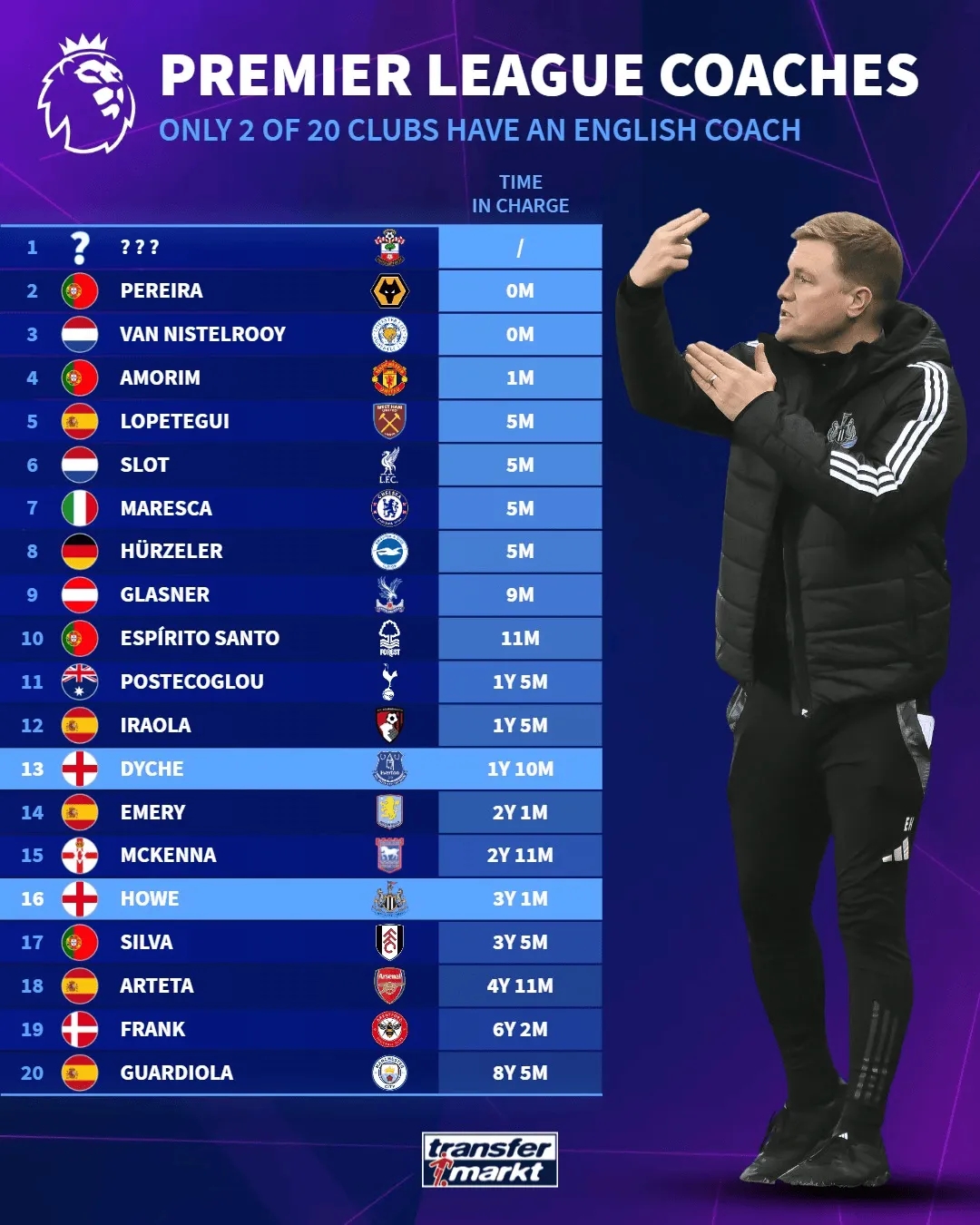 13、馬雷斯卡(切爾西)、赫爾澤勒(布萊頓)、斯洛特(利物浦)、洛佩特吉(西漢姆):5個月