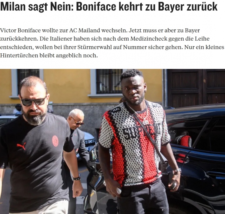 米蘭與藥廠原本已就一項包含買斷條款的租借協(xié)議達成一致,據(jù)悉為500萬歐租借外加2400萬歐買斷。但在博尼法斯接受意大利方面安排的強制體檢后,這筆交易最終被AC米蘭否決,博尼法斯因此不得不返回德國。