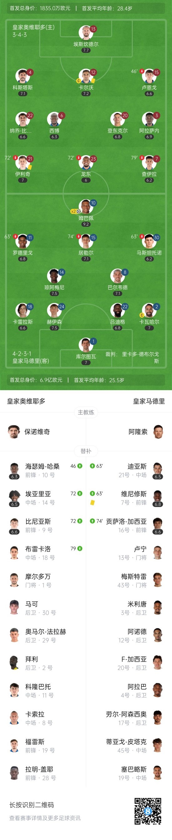 下半場(chǎng)補(bǔ)時(shí)3分鐘,皇家?jiàn)W維耶多0-3皇馬。