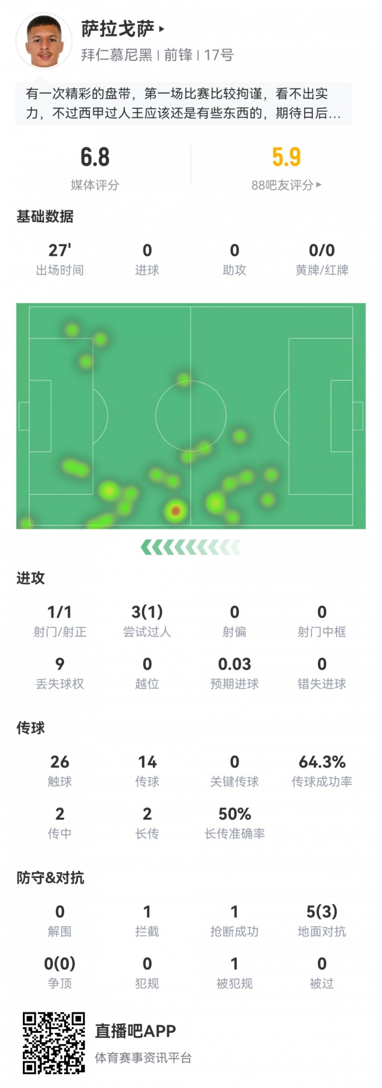 薩拉戈薩首秀數(shù)據(jù):替補(bǔ)27分鐘,1射1正,獲評(píng)6.8分