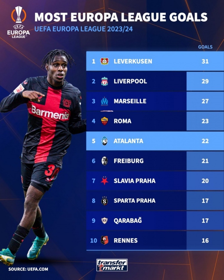 德國轉(zhuǎn)會市場統(tǒng)計了本賽季歐羅巴聯(lián)賽的進球數(shù)量,并列出了勒沃庫森31個進球,亞特蘭大22個進球排名第五。