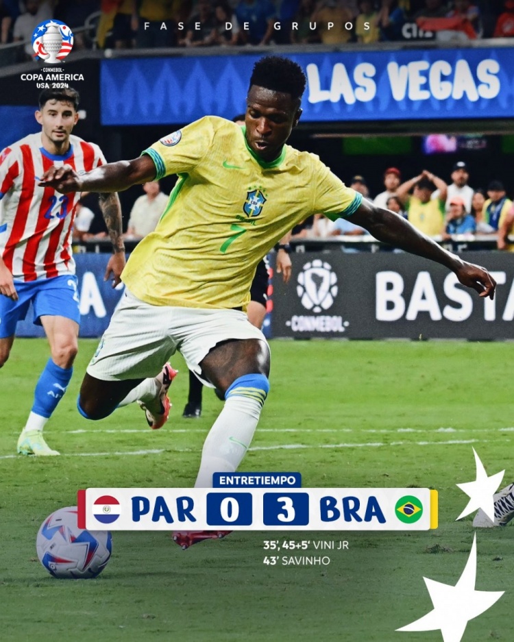 6月29日訊 北京時(shí)間6月29日99日北京時(shí)間6月29日:00,美洲杯小組賽D組第二輪,巴西對陣巴拉圭。帕奎塔上半場造點(diǎn),但罰失,維尼修斯雙響,薩維奧破門,巴西暫時(shí)3-0對陣巴拉圭。