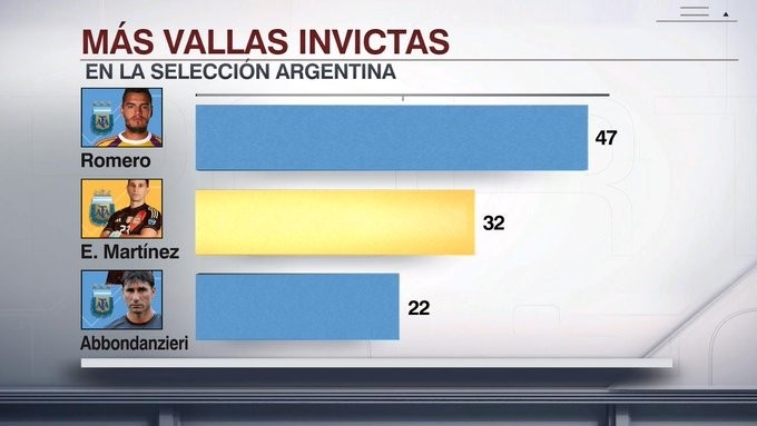 ESPN統(tǒng)計顯示,埃米利亞諾·馬丁內(nèi)斯已經(jīng)為阿根廷隊32次零封對手,現(xiàn)在在球隊歷史上排名第二,只有羅梅羅47次。