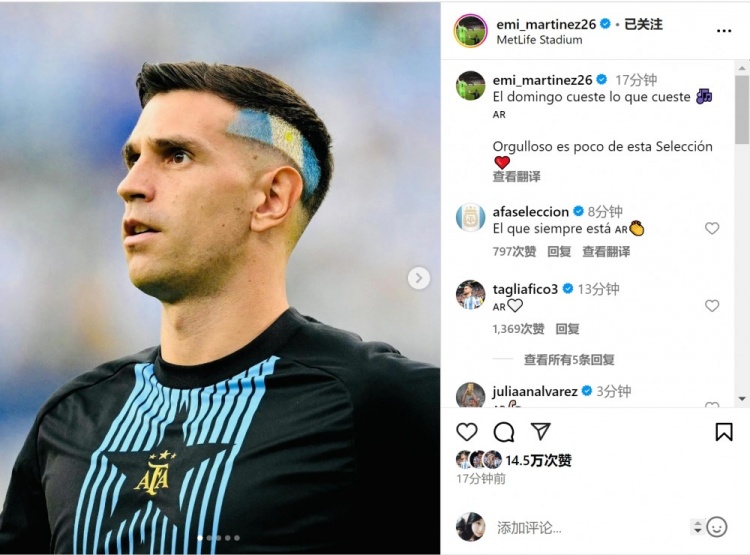 阿根廷將在決賽中對陣哥倫比亞和烏拉圭,馬丁內(nèi)斯在社交媒體上寫道:“周日的決賽將不惜一切代價(jià)贏得。驕傲仍然不足以描述國家隊(duì)的感受。”