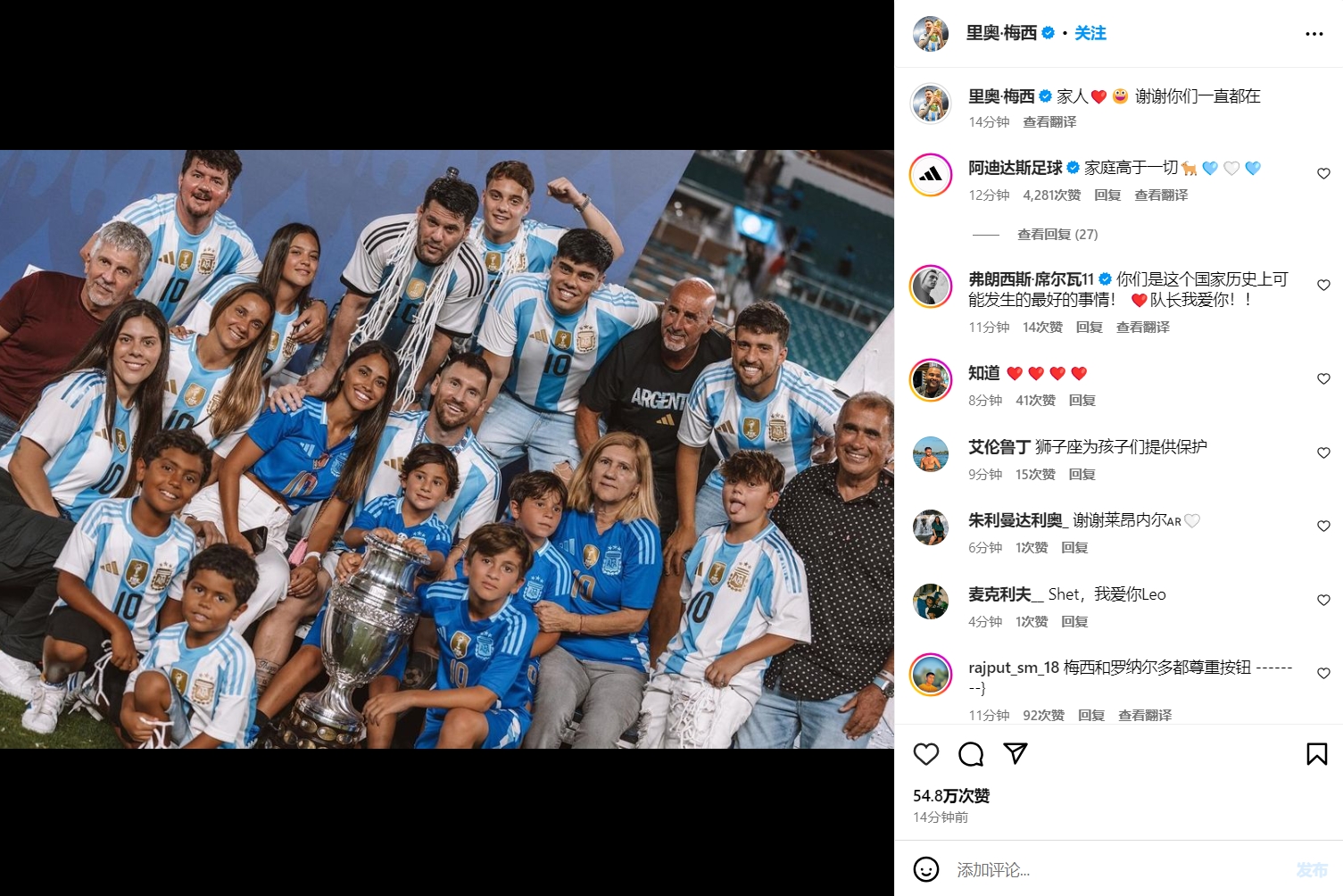 梅西社媒慶祝阿根廷奪冠,加納喬點(diǎn)贊+回復(fù):謝謝你,我的隊(duì)長(zhǎng)