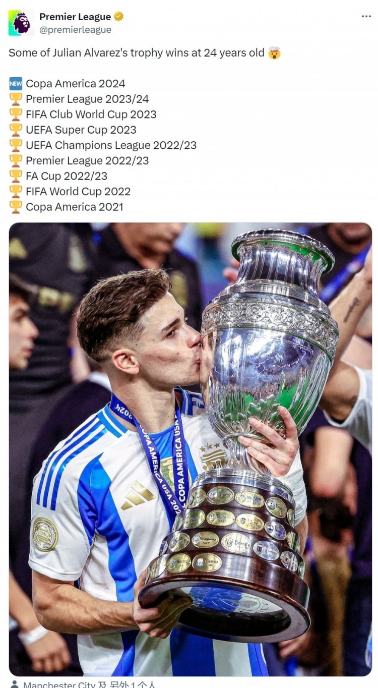 7月15日訊 阿根廷在美洲杯決賽中以1-0擊敗哥倫比亞,贏得了冠軍獎(jiǎng)杯。英超聯(lián)賽正式列出了阿爾瓦雷斯贏得的一些冠軍榮譽(yù)。