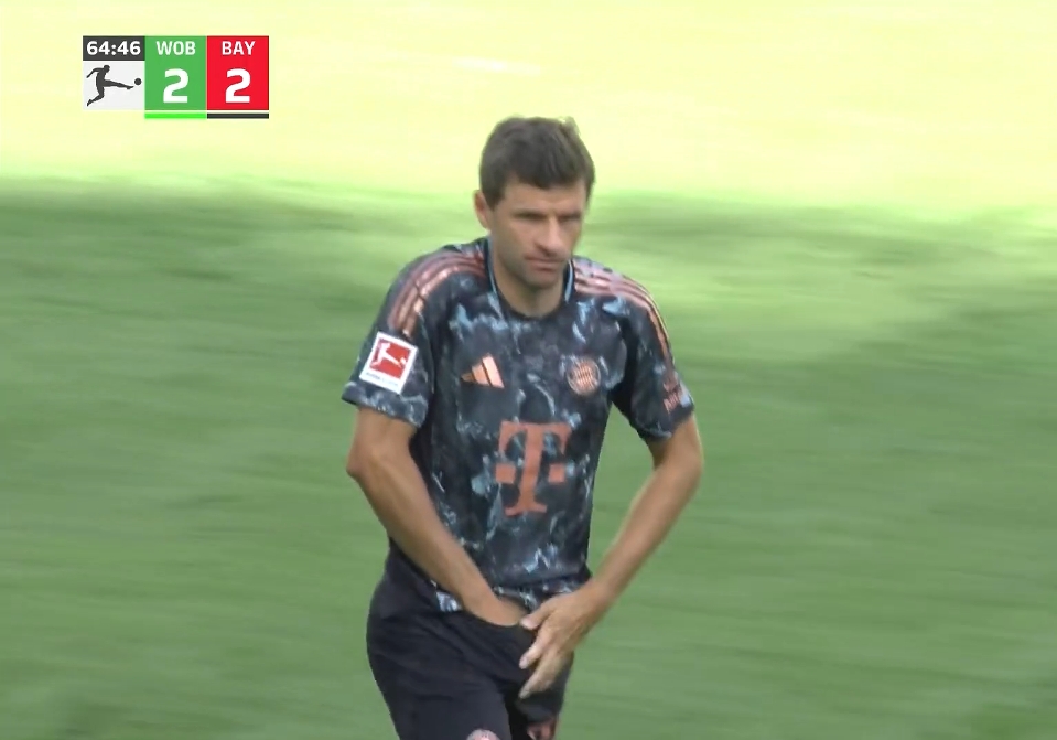 第65分鐘,拜仁換了人,穆勒換了博伊,然后拜仁角球進(jìn)攻,凱恩頭球擺渡,球擊中卡明斯基越過門線,穆勒在門內(nèi)補(bǔ)了一腳。鏡頭對(duì)準(zhǔn)了穆勒,穆勒在開球前從胯部拿出紙條給隊(duì)友看戰(zhàn)術(shù)。