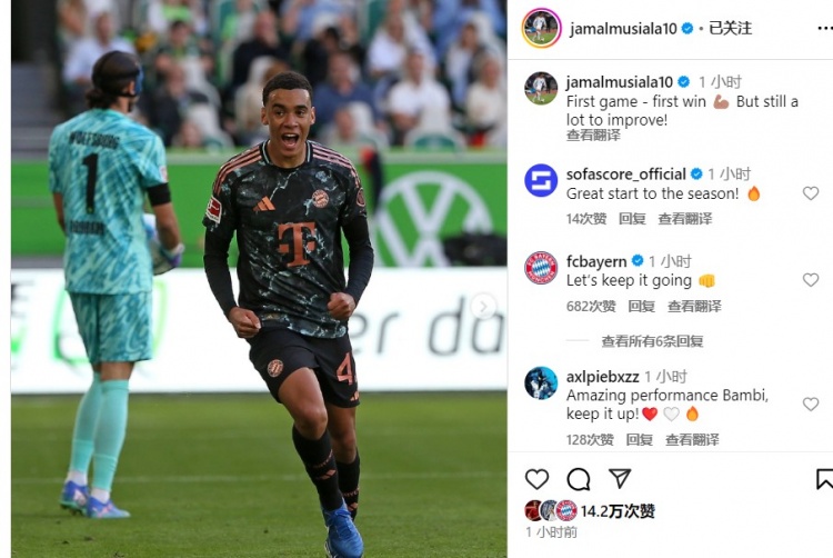穆西亞拉社媒:首場(chǎng)比賽,首場(chǎng)勝利但仍有很多要提高!