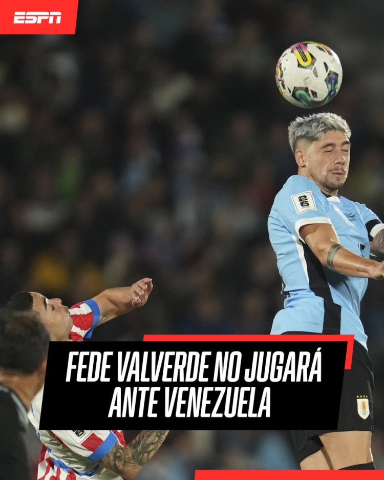 ESPN指出,巴爾韋德將缺席烏拉圭對委內(nèi)瑞拉的比賽,因為他積累了黃牌停賽。