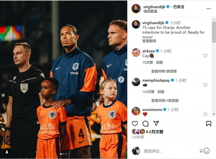 這場(chǎng)比賽是范迪克為荷蘭隊(duì)打的第75場(chǎng)比賽。他在社交媒體上寫道:“為荷蘭隊(duì)打了75場(chǎng)比賽,這是另一個(gè)值得驕傲的里程碑,準(zhǔn)備迎接更多!”