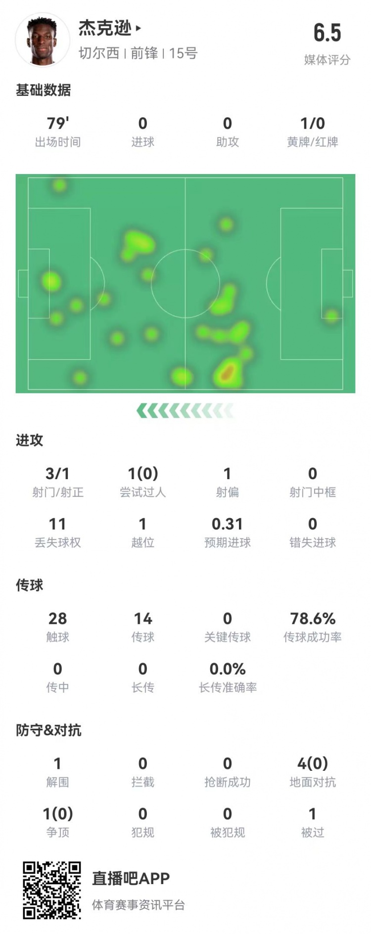 熟悉的味道!杰克遜本場(chǎng)3射1正 0關(guān)鍵傳球 5對(duì)抗0成功 獲評(píng)6.5分