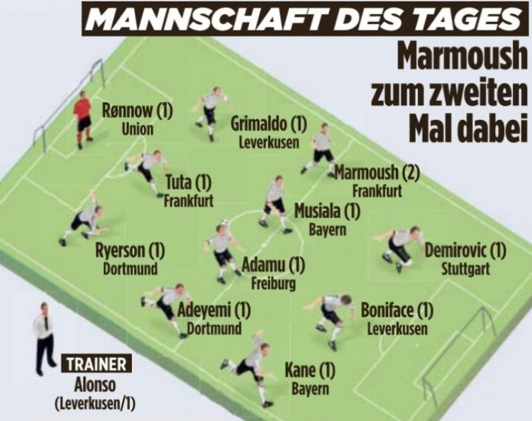 9月16日訊 這一輪德甲已經(jīng)結(jié)束,《圖片報》也評出了這一輪最佳陣容,拜仁、多特、制藥廠和法蘭克福各2將在名單上。