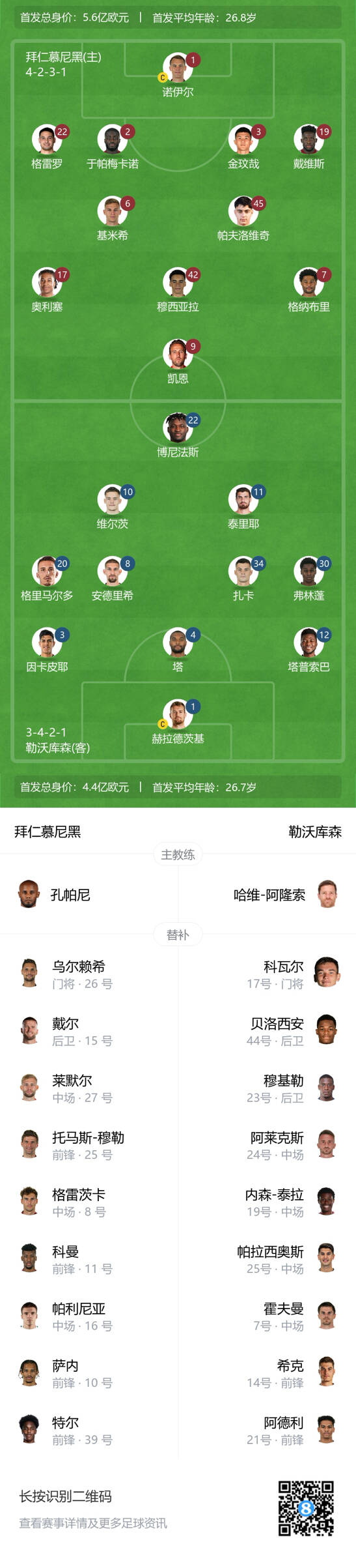 勒沃庫(kù)森首發(fā):1-赫拉德茨基、3-卡皮耶、4-若納坦-塔、12-塔普索巴、20-格里馬爾多、30-弗林蓬、34-扎卡、8-安德里希、10-維爾茨、11-泰里耶、22-博尼法斯