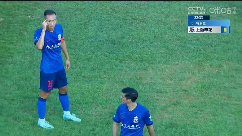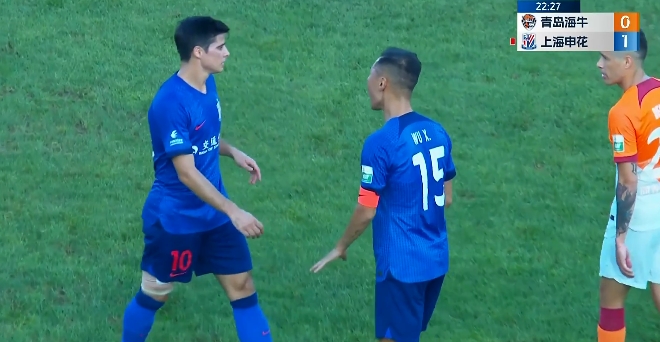 特謝拉對這次判罰不滿,上前對馬寧念念有詞,吃了黃牌。申花隊長吳曦趕緊把他拉走,示意冷靜下來。