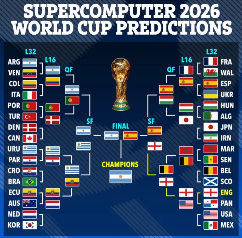 太陽(yáng)報(bào)報(bào)道,超級(jí)計(jì)算機(jī)預(yù)測(cè)了2026世界杯各支隊(duì)淘汰賽前景,最終阿根廷奪冠,英格蘭止步半決賽(注:太陽(yáng)報(bào)提供的圖中部分有誤,16強(qiáng)對(duì)決烏拉圭是對(duì)陣克羅地亞vs巴西勝者)。